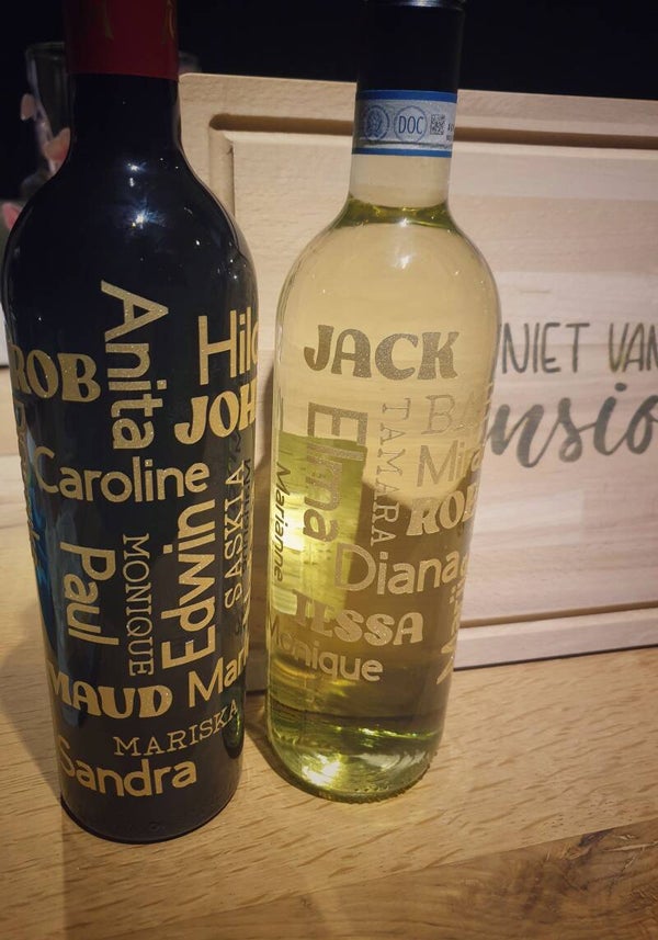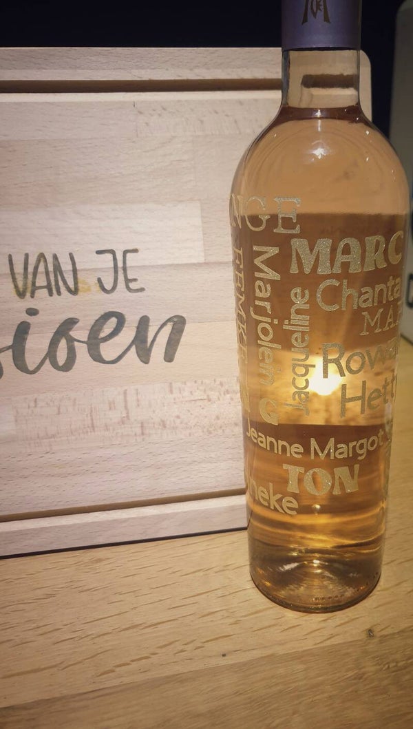 Maar dat is nog niet alles! Je kunt het etiket helemaal naar wens laten maken. Voeg een persoonlijke boodschap, een speciale datum of een uniek ontwerp toe om het cadeau echt uniek te maken. Of je nu een romantische boodschap wilt voor een bruiloft of een vrolijke felicitatie voor een verjaardag, wij zorgen ervoor dat jouw wijnfles een prachtig en onvergetelijk geschenk wordt.